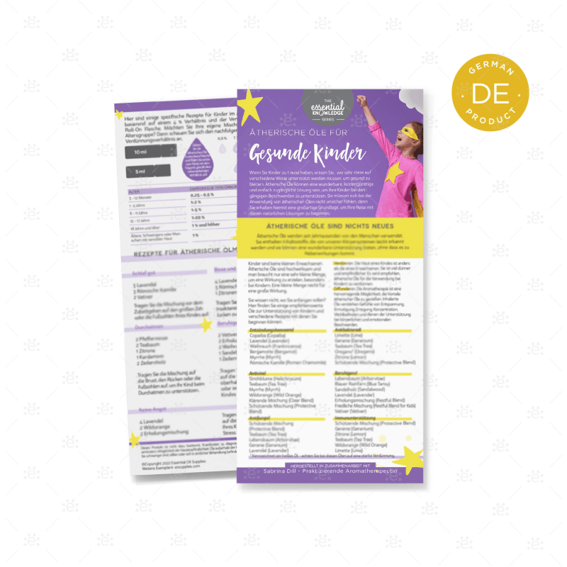 Wenn Sie Kinder haben, wissen Sie wahrscheinlich, wie sehr sie oft Unterstützung benötigen, um eine gute Gesundheit aufrechtzuerhalten. Diese Infokarte, jetzt auf deutsch erhältlich, Teil der "Essential Knowledge Series" und in Zusammenarbeit mit Sabrina Dill - Praktizierende Aromatherapeutin produziert, ist ein idealer Referenzleitfaden mit vorgeschlagenen ätherischen Ölen und Mischungen zur Unterstützung von Kindern bei der alltäglichen Gesundheit.