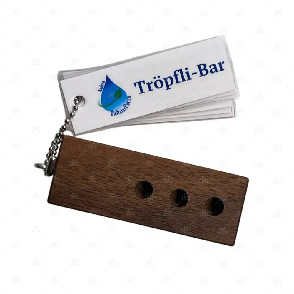 Die wunderbare Tröpfli - Bar zum einfachen abfüllen der Kapseln. Nussbaumholz mit tollen Rezepten an einem Ketteli, dadurch können sie ergänzt werden.