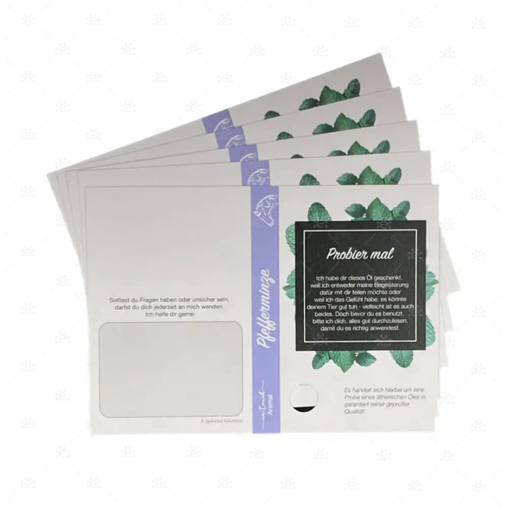 5 Karten, vorgefalzt, mit den wichtigsten Informationen über das jeweilige Öl rund um die Anwendung bei Tieren. Zusammengestellt und gestaltet von Mayca Spinnler.