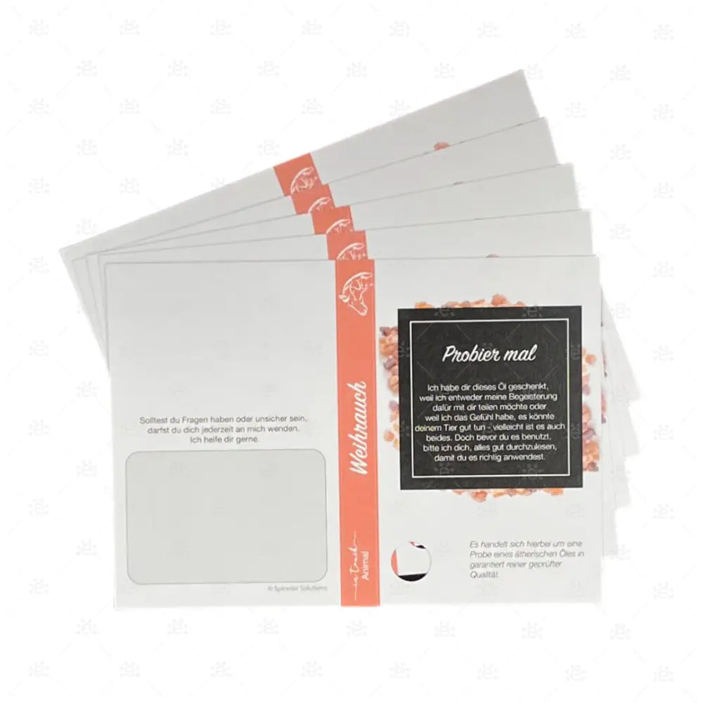 5 Karten, vorgefalzt, mit den wichtigsten Informationen über das jeweilige Öl rund um die Anwendung bei Tieren. Zusammengestellt und gestaltet von Mayca Spinnler.