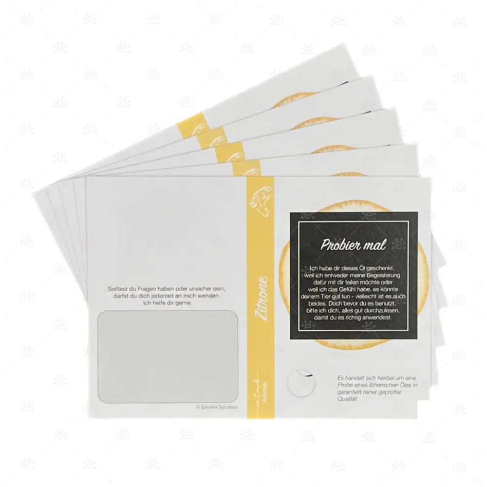 5 Karten, vorgefalzt, mit den wichtigsten Informationen über das jeweilige Öl rund um die Anwendung bei Tieren. Zusammengestellt und gestaltet von Mayca Spinnler.