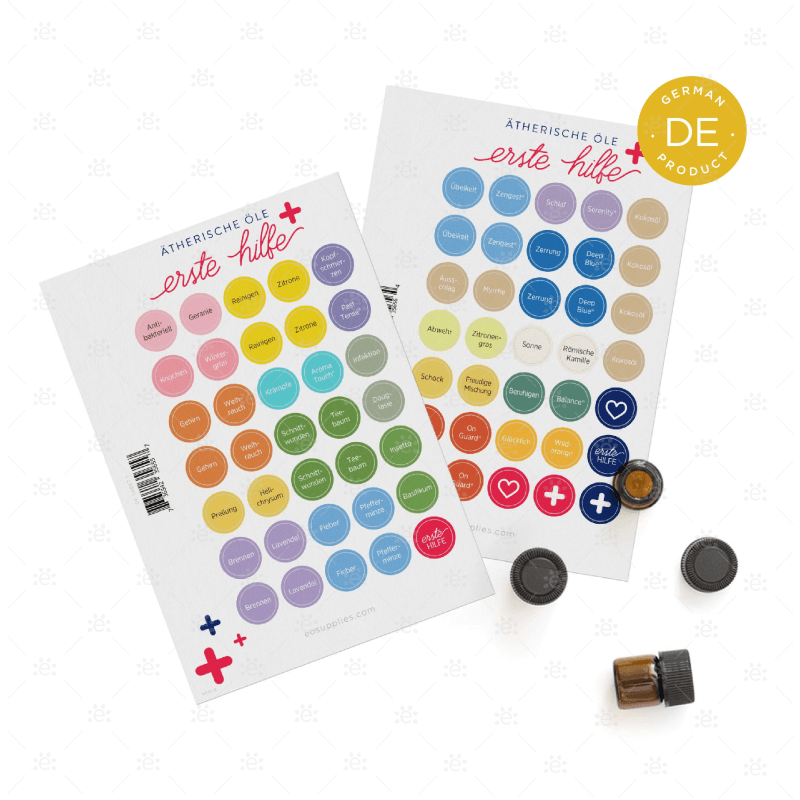 Ebenfalls enthalten sind 2 Bögen mit 35 deutschen Cap-Stickern mit allen oben genannten Beschwerden und entsprechenden Ölen/Mischungen erster Wahl inklusive einem passenden Cap Sticker geliefert. Diese sind ideal, um sie auf die Oberseite oder der Seite der Flaschen zu kleben, um die Beschwerde oder das Öl nach Deiner Wahl zu identifizieren. Es gibt auch 4 leere Etiketten, falls Du die Etiketten an Deine persönlichen Bedürfnisse anpassen möchtest.